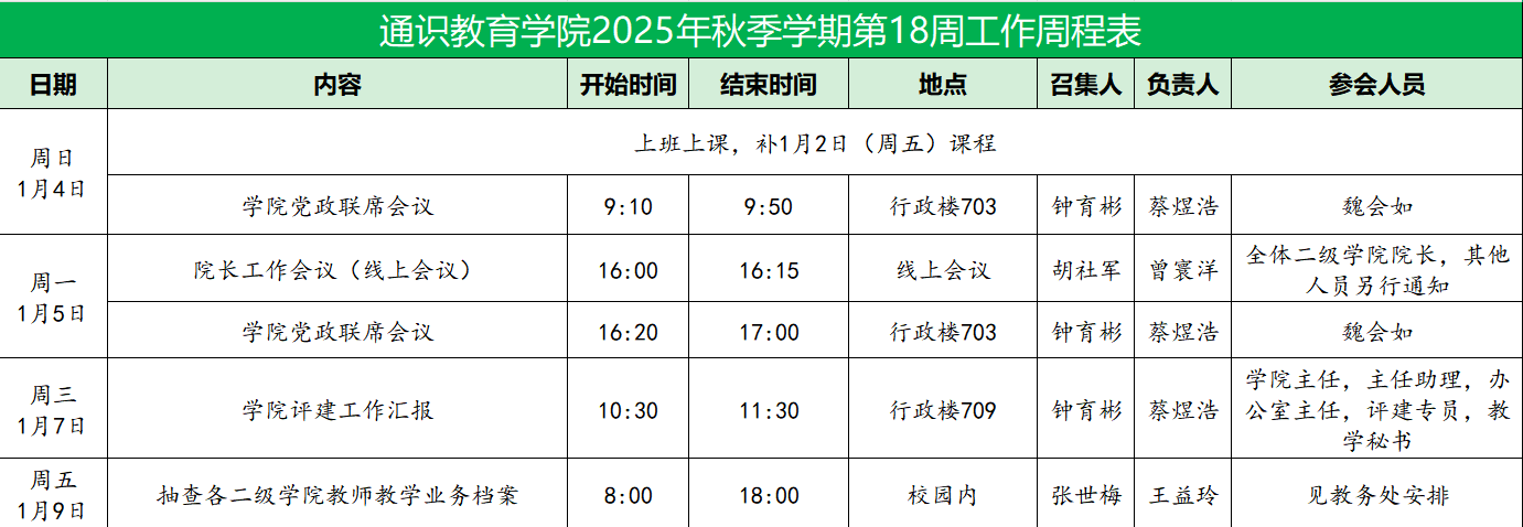 2025-2026学年第一学期通识教育学院第19周工作表