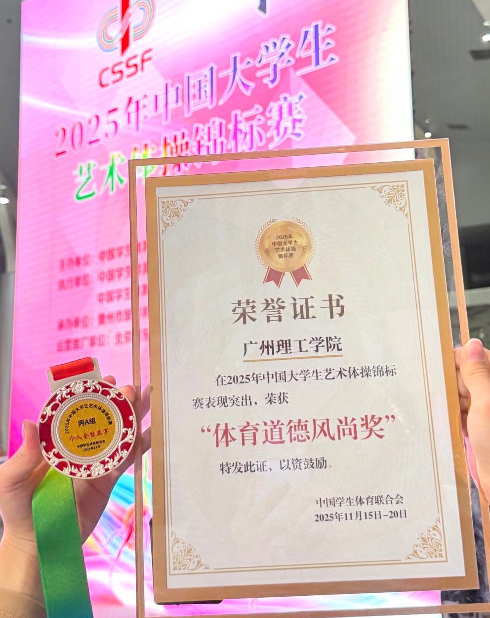 近日,2025年中国大学生艺术体操锦标赛圆满落幕。本次赛事为期6天,吸引了北京大学、清华大学等全国43所高校近500名运动员同台竞技,我校代表队在赛事中奋勇拼搏,不仅斩获多项竞技奖项,更获评"体育道德风尚奖"院校,在全国舞台上展现了广州理工学院的体育竞技实力与育人风采。